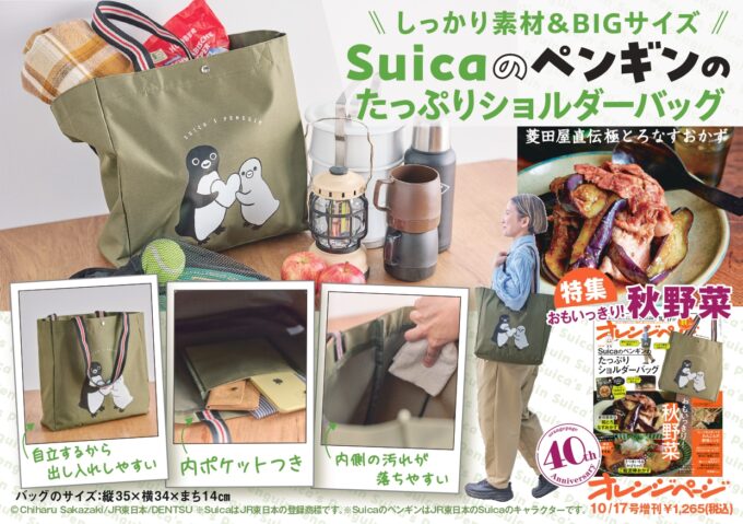 JR東日本のICカード〈Suica〉のイメージキャラクター「Suicaのペンギン」と『オレンジページ』のコラボ付録が、今年も登場! 第3弾となる今回は、大きめサイズで使い勝手バツグンの「たっぷりショルダーバッグ」が完成しました!
