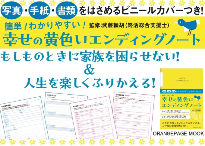 これまでの幸せを実感でき、この先の不安を解消する一冊。大切な人や素敵な思い出を振り返ることで充足感が得られ、財産や相続、医療、介護、墓等について記入しておくことで、もしもの時に家族が困らず安心。写真や手紙、書類を挟めるビニールカバーつき。