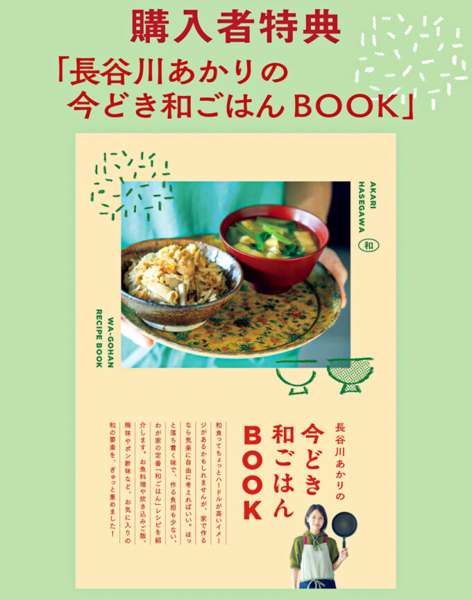 2026年1月26日発売『長谷川あかりの「あたらしい」きほんの料理 自由で作りやすい、誰でもおいしくできる。』をご購入いただいた方に、特典として小冊子『長谷川あかりの今どき和ごはんBOOK』を一部の書店にてプレゼントいたします。配布店舗の一覧は以下をご覧ください。